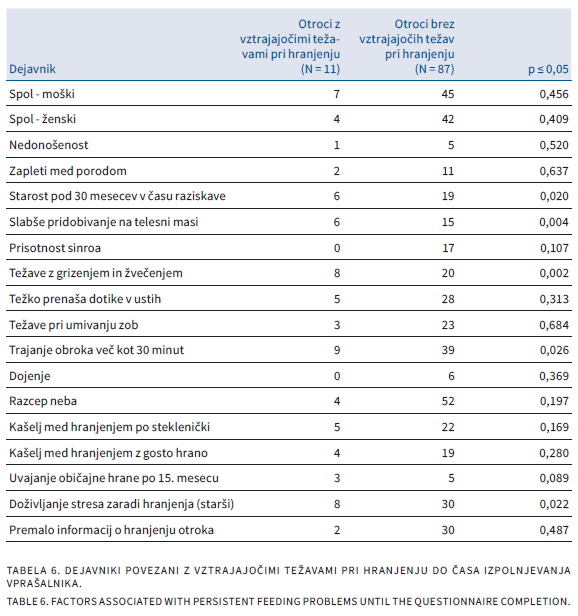 Izhodišča: Pri razcepu neba, z razcepom ustnice ali brez njega, in oz. ali pri razcepu čeljustnega grebena gre za prirojeno obrazno nepravilnost, ki zaradi odprte povezave med ustno in nosno votlino od rojstva dalje vpliva tudi na hranjenje. V raziskavi smo proučevali, kakšne težave imajo otroci z razcepom neba (angl. cleft palate, CP) in z razcepom ustnice in neba (angl. cleft lip and palate, CLP) pri hranjenju, ali težave pri hranjenju vztrajajo tudi še v obdobju malčka, ali se otroci s CP in CLP razlikujejo glede pogostnosti motenj hranjenja in kaj so značilnosti otrok, ki so potrebovali alternativne načine hranjenja. Metode: Podatke o hranjenju smo pridobili s pomočjo anketnega vprašalnika, ki so ga izpolnili starši otrok, rojenih v zadnjih petih letih pred začetkom raziskave. S pisnim dovoljenjem staršev smo podatke vprašalnika dopolnili s podatki iz otrokove zdravstvene dokumentacije. Rezultati: V raziskavo je bilo vključenih 98 otrok (41 % povabljenih), od tega 56 otrok s CP in 42 otrok s CLP. Ugotovili smo, da pri približno desetini otrok s CP in CLP težave s hranjenjem vztrajajo tudi po drugem letu starosti oz. celo po končanem kirurškem zdravljenju v tretjem letu starosti. Ti otroci imajo statistično zna-čilno več težav. 14 otrok je v prvem letu življenja več mesecev potrebovalo nazogastrično sondo za hranjenje, 1 otrok pa celo gastrostomo. Najpomembnejša dejavnika, povezana z uporabo teh alternativnih metod hranjenja, sta bila prisotnost sindroma pri otroku in CP. Skupini otrok s CP in CLP se glede težav s hranjenjem večinoma nista statistično značilno razlikovali. Zaključki: Poznavanje dejavnikov tveganja za vztrajanje težav s hranjenjem v obdobju malčka je ključnega pomena, saj omogoča strokovnjakom pravočasno ukrepanje. Le otrok, ki je primerno prehranjen, se lahko normalno razvija, kar pozitivno vpliva na kakovost življenja otroka in njegove družine.